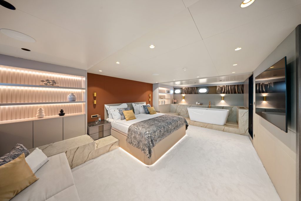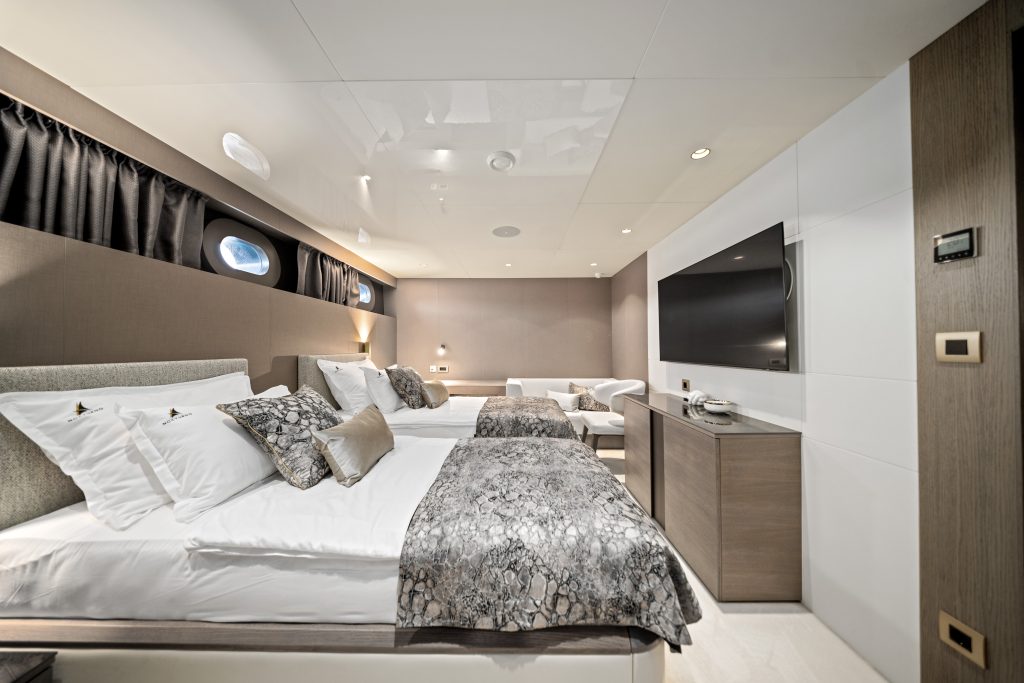 Nocturno’s six calm, welcoming cabins are designed with first‑class comfort. The master and VIP suites feature king‑size beds and en suite bathrooms, with the VIP suite offering a bathtub for an extra touch of ease. The remaining four cabins can be arranged as double or twin, giving families and friends the flexibility they need. With plenty of space and a gentle, peaceful atmosphere, Nocturno feels like a quiet retreat made for everyone on board.